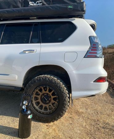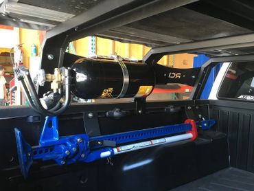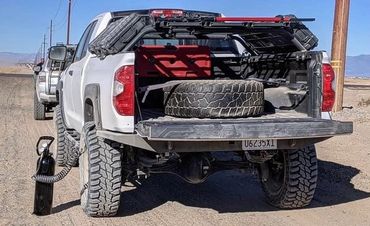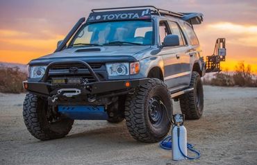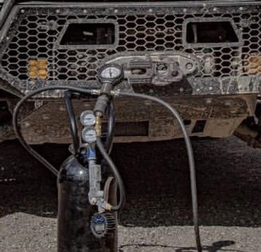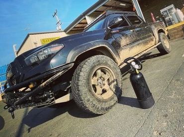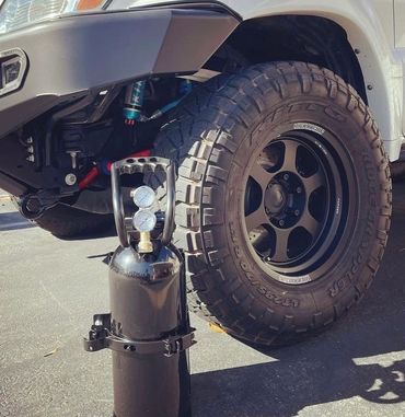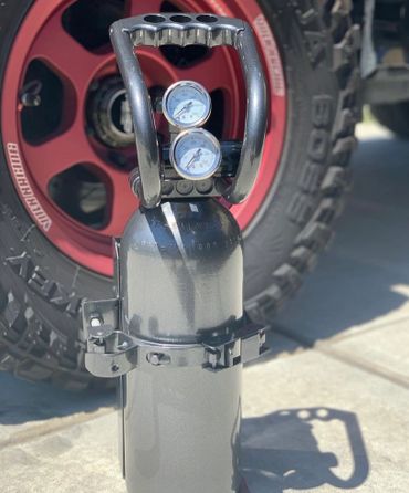 Mount your SOURCE Co2 tank to a Jeep rear tire mount lug, temporary with tire ratchet straps, roll bar clamps, on your roof rack or on a flat surface with our universal L-brackets - Preece has mounting options for the Source.